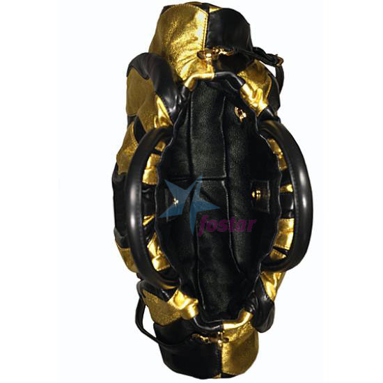 Описание : Получите свое затруднительное положение очарования с этой шикарной сумочкой. Драматические черные-и-золотые полосы на коже металлического взгляда дают Вам в во всех лучших местах. Украшенный с goldtone эмблема и аппаратные средства для дополнительного таланта, и законченный с двойной ручкой и вершиной почтового индекса. Включает дополнительную лямку. Измерения: 15 "L x 3" W x 12 "H; 5" ручек снижения; 16" сменных ремней.