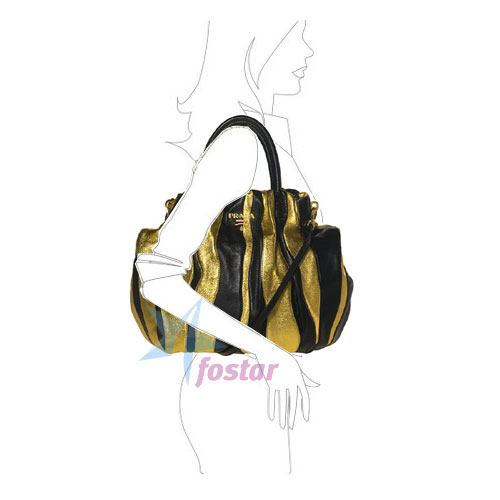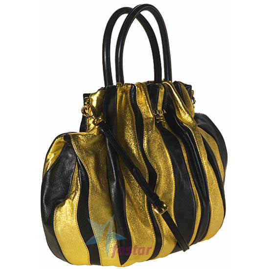 Описание : Получите свое затруднительное положение очарования с этой шикарной сумочкой. Драматические черные-и-золотые полосы на коже металлического взгляда дают Вам в во всех лучших местах. Украшенный с goldtone эмблема и аппаратные средства для дополнительного таланта, и законченный с двойной ручкой и вершиной почтового индекса. Включает дополнительную лямку. Измерения: 15 "L x 3" W x 12 "H; 5" ручек снижения; 16" сменных ремней.
