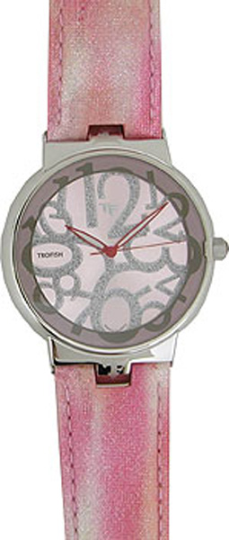 Табло: Часы, минуты, секунды. Циферблат - розово-серебристый, украшен цирконами.
